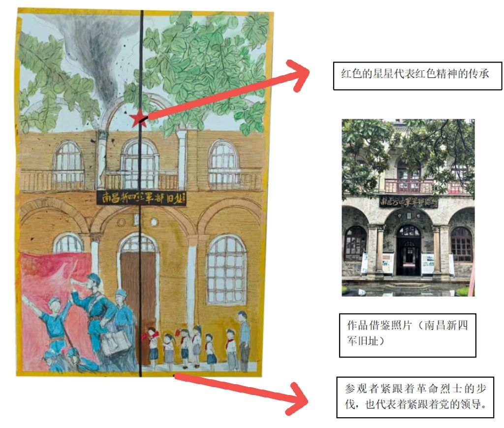 这幅作品以南昌新四军旧址为蓝本创作。画面里,红色星星象征红色精神传承,参观者紧跟革命烈士步伐,代表着紧跟党的领导,尽显对革命精神与党的追随,黑线左侧描绘的是抗日时期革命烈士抛头颅洒热血的场景,右侧是描绘当今中国人民不忘历史参观新四军旧址的场景。通过左右时空对比展示出美好生活的来之不易。