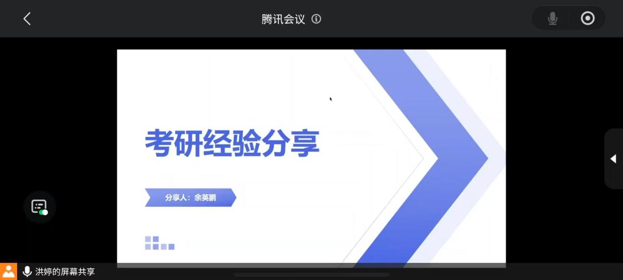 最后,由就读于长江大学的余英鹏进行分享。余英鹏主要从备考经验和心态调整等方面进行分享。余英鹏表示,外语的复习尽量要早开始,专业课能过几遍就过几遍,并且专业课主要以做题为主。学习时间长不等于学习效率高,要适当放松,合理安排时间。专业课忘记了很正常,不要过度焦虑,知识点就是一个不断重复再重复的过程。要跟着自己的节奏走,不要过多关注外界的声音,按照自己的计划一步一个脚印;一定要坚持、坚信、坚定,每天告诉自己:你一定会成功。保持对未来的憧憬,多多相信自己。