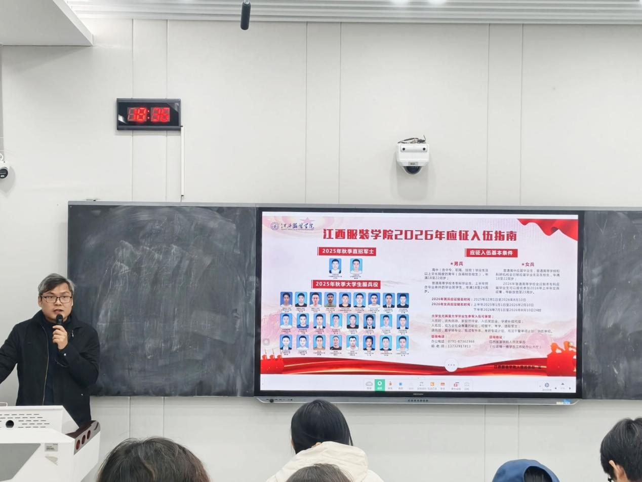 服装工程学院讯(撰稿人:李博亿、余佳爱)为响应国家号召,帮助大学生了解参军入伍政策,进一步拓宽毕业生职业发展路径,11月30日晚6:00,服装工程学院在主教楼-110教室组织开展了大学生参军入伍政策宣讲会,此次宣讲会特别邀请了江西服装学院人民武装部的胡康主讲。