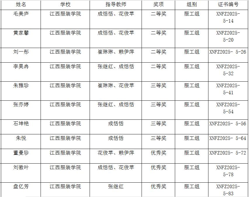 在这场专业竞技中,我院服装专业学子表现优异,斩获多项荣誉。由成恬恬、花俊苹、崔琳琳、张继红、赖伊萍老师指导的学生团队脱颖而出:23 服工本科 3 班毛美庐、22 服工本科 4 班黄家馨、23 服教本科 1 班刘一彤、22 服教本科 1 班李昊冉凭借出色表现荣获二等奖;23 服工本科 1 班朱雅珍、22 服教本科 1 班张亦婷、22 服工本科 2 班石坤艳、朱悦获三等奖;22 服工本科 3 班董曼珍、23 服工本科 3 班刘徽叶、23 服教本科 1 班盘亿芳亦凭借实力赢得优秀奖。