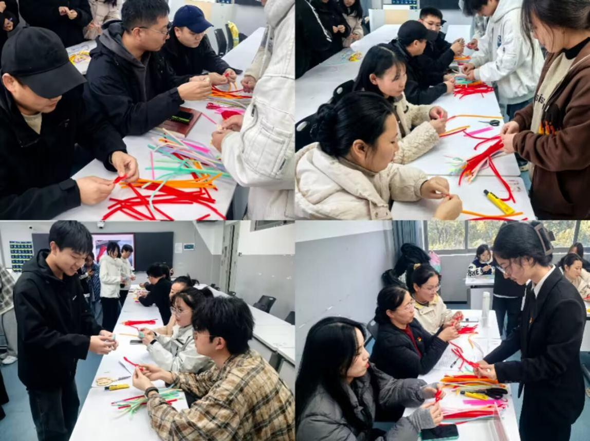 在手工实践环节中,老师们以扭扭棒编制中国结为载体,开启创意创作。活动现场,大家围坐在一起,从扭扭棒的造型调整到绳结的缠绕固定,一边分享日常工作中的趣事与经验,一边合力完成一个个精巧的中国结,原本互不熟悉的教职工在手工创作的过程中拉近距离,笑声与交流声此起彼伏。一根根色彩缤纷的扭扭棒在手中穿梭缠绕,既编织出承载千年文脉的中国结,也勾勒出青年教职工的青春梦想。