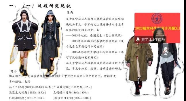 本次汇报共分为 23 个小组,开题汇报工作流程为:学生结合 PPT 陈述、指导教师针对性提问、学生回答。开题汇报期间网络畅通,学生重点围绕“选题研究现状与意义、研究内容与方法、创新点、设计效果图以及计划进度”进行阐述,现场学生所准备的开题汇报 PPT 内容详实、陈述清晰;指导老师从选题的应用价值、前期调研与准备工作充分程度、研究内容与创新点、款式设计的合理性以及最终工艺实现的可行性等角度进行了点评,点评效果佳、维度全;各小组实时记录了开题汇报评分表并留存汇报资料。