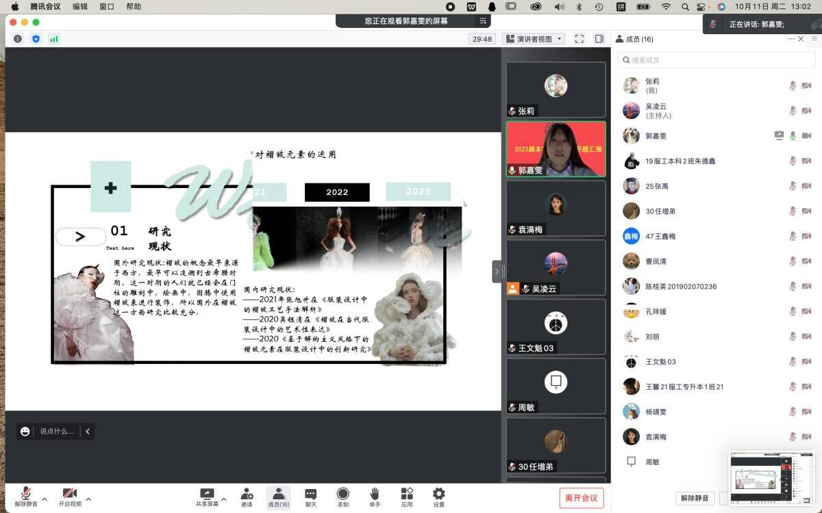 为了更好地推动毕业设计各阶段工作的开展,提升毕业设计整体质量,服装工程学院毕业设计开题汇报工作按照既定时间于 10 月 11 日下午 13:00 有条不紊地拉开了帷幕。2023 届纺织工程、服装设计与工程、服装设计与工艺教育三个专业的全体本科毕业生及全体毕业设计指导老师参加了毕业设计开题汇报会。在毕业设计工作启动至今,学院领导班子高度重视毕业设计相关工作,基于目前疫情防控的大背景,此次开题汇报采用腾讯会议线上汇报的方式。