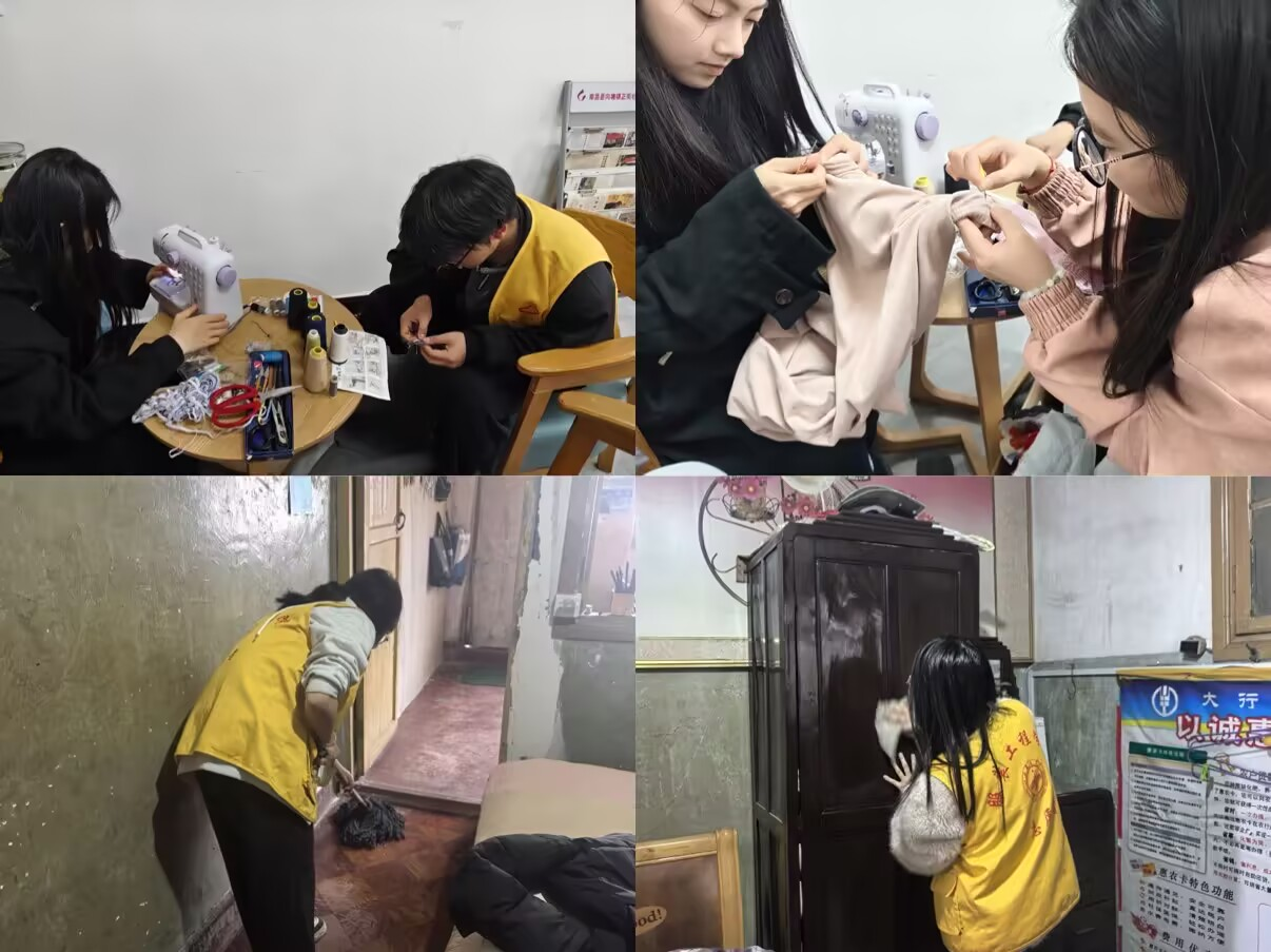 活动当天,志愿者们发挥服装专业特色,为居民提供衣物缝补、裤脚修改、纽扣更换等服务,细心地为大家修补破损的衣物。志愿活动结束后,大家拿起清洁工具,将斑驳的地面变得干净整洁,擦拭柜体及周边设施,认真清理垃圾杂物,营造干净整洁的社区环境。志愿者们热情饱满、认真负责,用实际行动展现了青年学子的责任与担当,得到了社区居民的一致认可与好评。