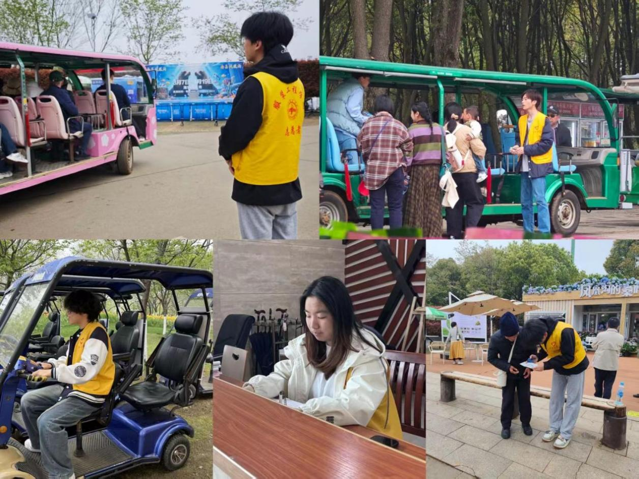 活动中,服装工程学院的师生们紧扣景区服务需求,精准对接岗位开展劳动实践。在景区的乘车中心、樱花谷站台、茶海站台等观光车站台,志愿者们化身引导员,协助游客有序排队、完成验票上车,保障景区观光交通顺畅运行;在北大门、中门、北门广场等区域,同学们分别承担老年代步车出租协助、验票秩序引导、购票指引等工作,为游客提供便捷的入园交通服务,细心解答游客关于购票方式、入园流程的各类疑问。