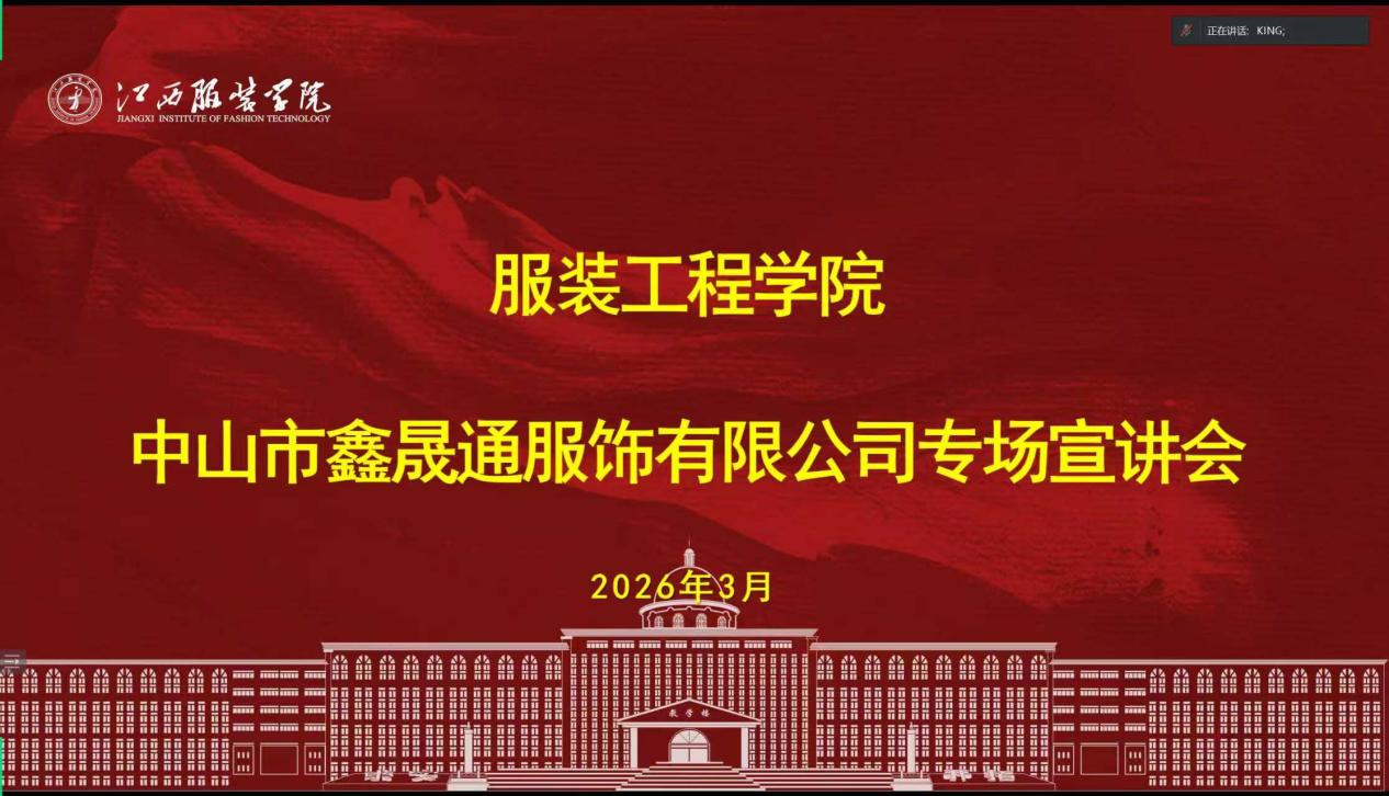 为精准对接企业人才需求,助力我院学子拓宽就业渠道、提升就业竞争力,3月9日晚7:00,服装工程学院特邀中山市鑫晟通服饰有限公司走进云端,为同学们带来优质岗位与就业机会。