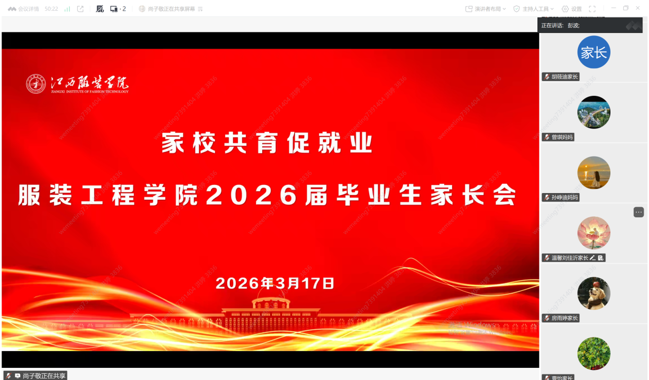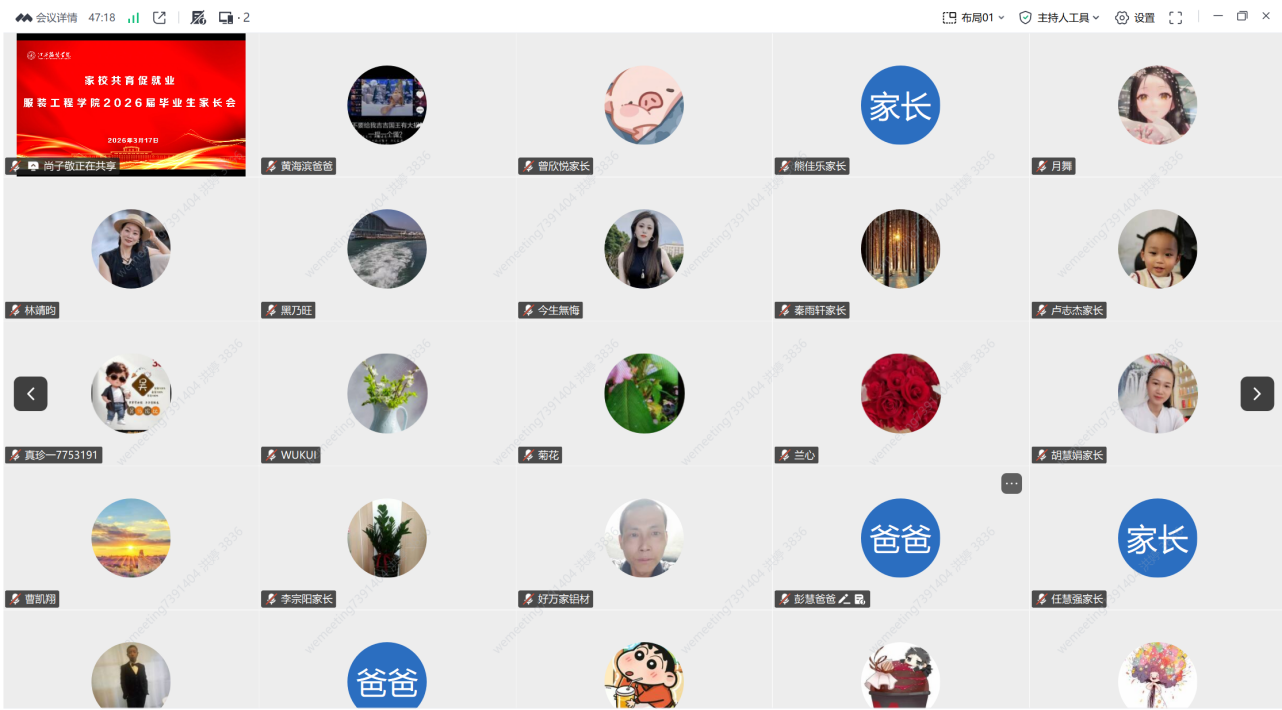 为切实做好2026届毕业生的相关工作,深化家校协同育人,助力毕业生顺利完成学业、精准对接就业岗位,3月17日晚7:30,服装工程学院以线上会议的形式召开2026届毕业生家长就业动员会,服装工程学院党委书记彭波、副书记张敬玲,以及全体毕业班班主任参加了会议,会议由服装工程学院学工办副主任洪婷主持。