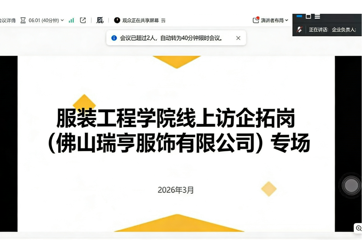 为拓宽学生就业渠道,助力学院毕业生高质量就业。近日,服装工程学院与佛山瑞亨科技有限公司以线上形式开展了交流活动,深入了解企业发展现状及对人才的需求,共同开拓毕业生优质就业岗位,实现协同育人,为后续合作奠定基础。
